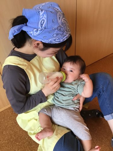 先生の優しい眼差しのもと、おいしそうに離乳食を食べています。