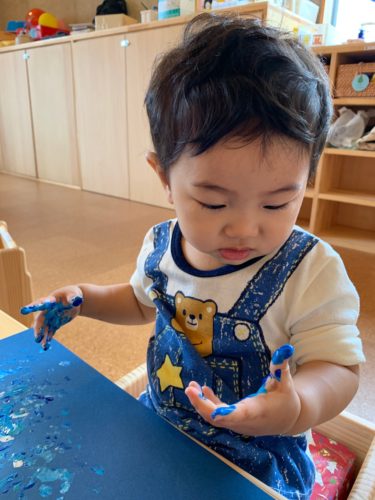 今日はひよこ組(0歳クラス)が絵具あそびをしてい