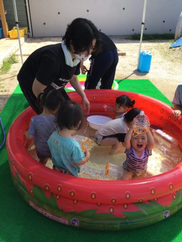 ひよこ組(0歳クラス)さん。水あそびにもすっかり慣れて、お水を