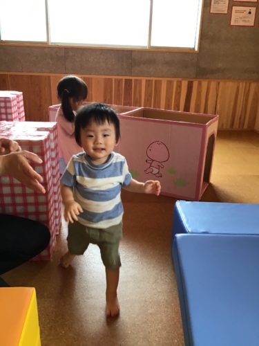 今日はりす組(1歳クラス)とひよこ組(0歳クラス) さんは、お部屋で運動遊びをしています。 大きなマットやソフトブロックを並べて、登ったり くぐったり・・・☆ バルシューレの講師の先生も飛び入り参加で 一緒に遊んでくれました!!
