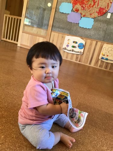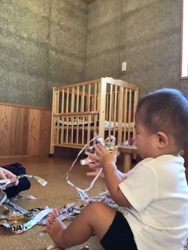 ひよこ組(0歳クラス)さん。 朝のおやつが終わると広告を使った遊びが 始まりました。 先生に広告をたくさん破いてもらって、上から 降らせて『バシャーン!!』と水に見立てたり☆ 紙が床や壁に擦れる音を楽しんだり☆ 先生の真似をして、指先を使って細かく破いて みたり☆ 子ども達にとって広告紙も立派な教材。 感触を確かめて、指先でつまんで夢中です☆