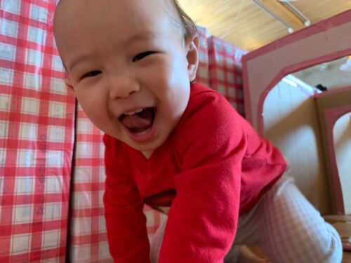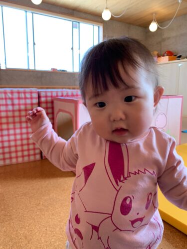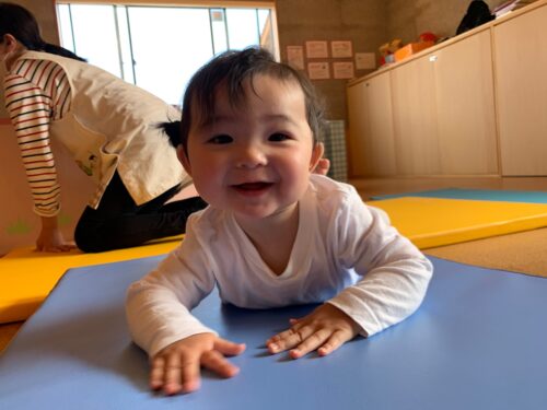 4月の入園から1ヵ月以上が経過し、だんだんと ほいくえんの生活に慣れてきているひよこ組 (0歳クラス)さん。 先生やお友達と一緒に安心して遊んでいます。 少しずつ歩けるようになってきたお友達は お部屋に準備したマットの上を歩いてみます。 ばぁぁ! こちらは、先生の手作りトンネルをくぐって出てきたところ。 先生にとても楽しそうな笑顔を見せてくれます。 こちらも楽しそうな笑顔☆ 腹ばいになって腕の力で進んだり、ハイハイをしてみようと したりしています。 子ども達の成長は一瞬のできごと☆ その一瞬を見逃さないように保護者の方と一緒に見守って いきたいと思います。