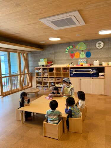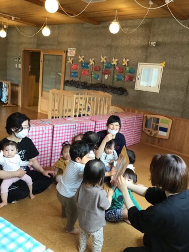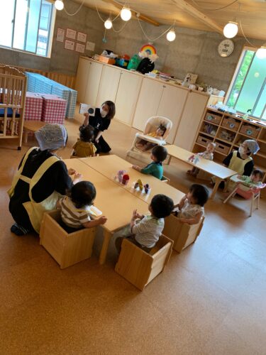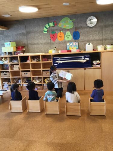 本のほいくえんは、絵本と触れる時間を大切に した保育を行っています。 朝の会で集まった時に先生に読み聞かせを してもらったり・・・ こうやって絵本に出てくる食べ物を食べる真似を 順番にしたり・・・ 給食を食べる時にも座ってみんなで絵本を 見ます。 さあ、食べ物が出てくる絵本を見ていたら お腹が空きました! これから先生が給食を運んでくれます。