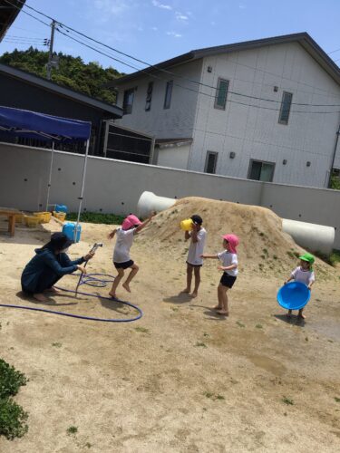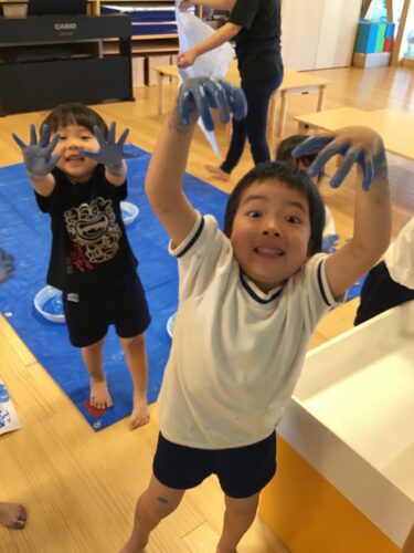 きりん組(3,4,5歳クラス)さんは、 今日は絵具遊びをしています。 手についた絵具の感触を確かめたり、 大きな紙に手形をつけたりしています。 見てーーー!!! とっても良い表情☆ ほいくえんならではの遊びに子ども達も 夢中で楽しんでいます! そして、絵具あそびが終わると、今度は 園庭へ。 裸足で出て、みんなで水遊びを楽しみます。 先生の持つシャワーに向かっていったり、 逃げ回ったり! 歓声をあげて楽しそう☆