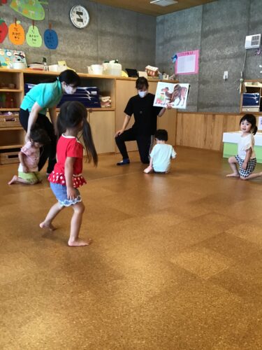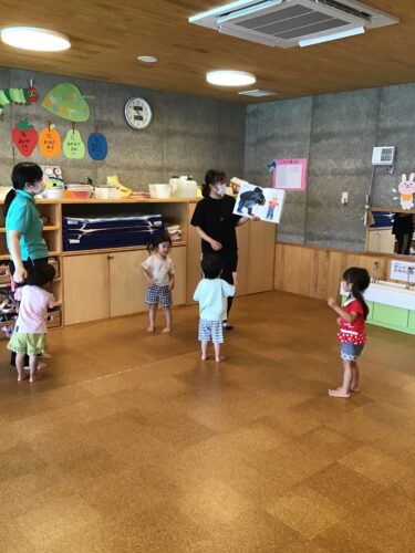 エリックカールの作品。 できるかな?あたまからつまさきまで この絵本を見て、うさぎ組さん(2歳クラス) は身体を動かしています。 絵本に出てくる動物の真似をしてみます。 だんだんと、先生よりも先に絵本を見て 真似をしてみる子ども達。 うさぎ組さんは、この絵本が大好きです。