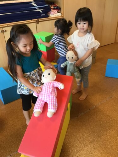 お人形のお世話をして、すべり台も