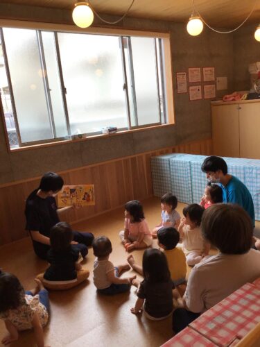 本のほいくえんには、約2000冊の 絵本や紙芝居、大型絵本があります。 今日は、ひよこ組さん(0歳クラス)と りす組さん(1歳クラス)が、朝の集まりで 歌の絵本を見ています。 『やまのおんがくか』の歌です。 先生と一緒に絵本を見て、歌もだんだんと 覚えます。 本のほいくえんの子ども達は、絵本を通して 歌にもたくさん触れています。