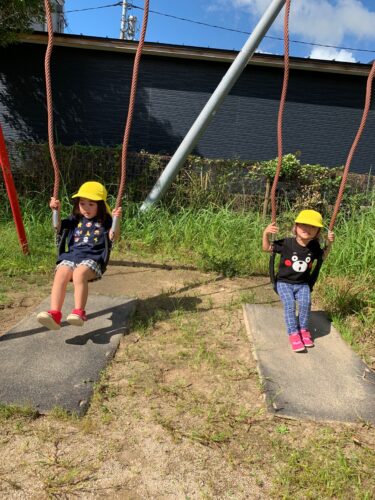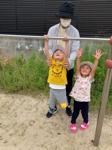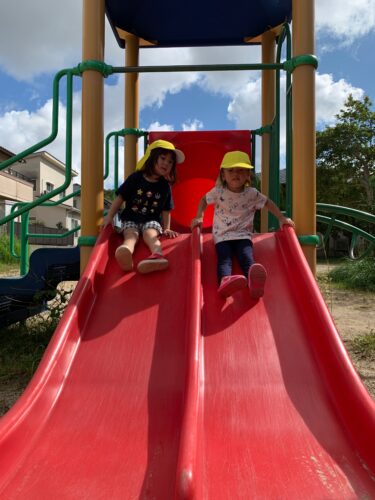今日は良い天気! うさぎ組さん(2歳クラス)が お散歩にでかけました。 公園に到着。 さっそくブランコに乗ってみます! こっちはすべり台。 お友達と一緒にシュー! 楽しいね☆ こっちは鉄棒。 先生に手伝ってもらって挑戦です! だんだんと秋らしい気候になって 外あそびが楽しいね☆