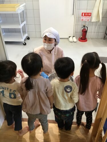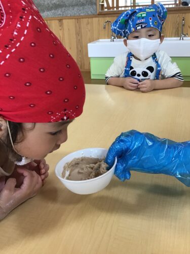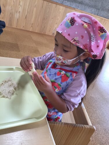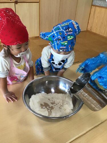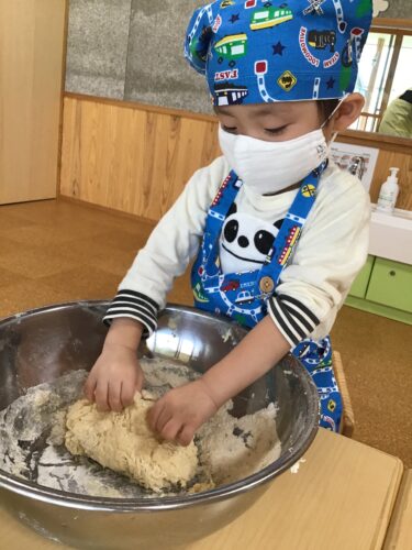 今日は、うさぎ組さん(2歳クラス)が クッキング!あんまんの生地づくりに 挑戦です。 最初は粉。触ってみると気持ちいいー! これは、ドライイースト。 なんか匂いがするね・・・。 先生が粉に水を入れています。 どうなるんだろう・・? こねこね☆ だんだん生地になってきた! 生地を丸められるかな? なかなか難しいね・・・ できあがった生地を給食室に持って 行きます。 『給食の先生できたよー!』 給食室の先生が仕上げをしてくれて 午後のおやつに食べました。