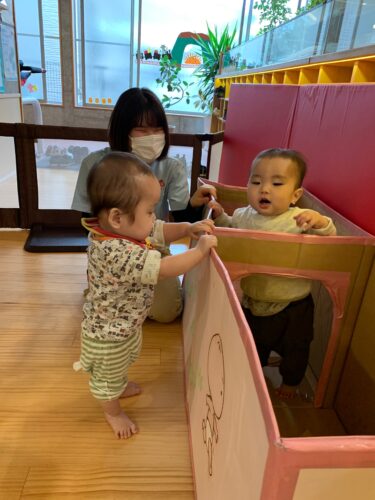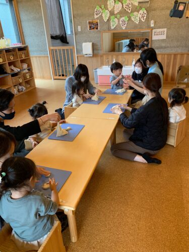 今日は参観日。 お父さん、お母さんが来てくださいました。 りす組さん(1歳クラス)は 小麦粉粘土で遊んでいます。 お父さん、お母さんと一緒に こねたり、丸めたり☆ ひよこ組さん(0歳クラス)は いろいろな仕掛けを廊下に作って 遊んでいます。 お友達と顔を出し合ったり・・・ 本棚から自分で絵本を選んで、読んで もらったり・・・☆ いつも、どのようにしてほいくえんで 過ごしているのかをお家の方に 見ていただきました!