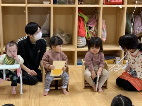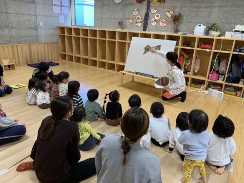 今日は11月生まれのお友達の お誕生会です☆ みんなで、先生と一緒に手あそびを して楽しみます。 お誕生のお友達。 お友達の前に出て、ちょっと恥ずかしいけれど、 先生にお名前を聞かれて答えたり、 好きな絵本を教えてくれたりしました! こちらは、みんなの大好きな はらぺこあおむしのパネルシアター。 みんな夢中になって見ています☆