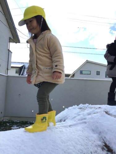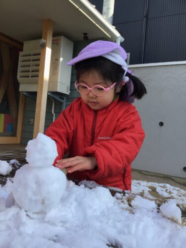 今日は、ちょっとだけ 雪が降りました。 さっそく園庭に出てみる 本のほいくえんのお友達。 ちょっとだけ、築山にも 雪が積もっています。 そこをゆっくり歩いて 足跡をつけて・・・ テーブルの上にも ちょっとだけ雪が 積もっています。 小さな雪だるまなら できそうだね☆