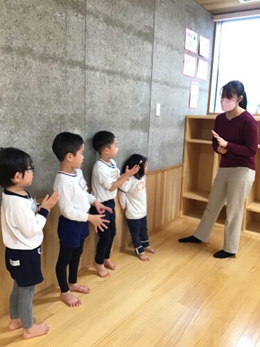 今日は英語あそび。 きりん組さん (3,4,5歳クラス)が 参加しています。 英語で書かれたカードを めくったり・・・ 音楽や英語の先生の掛け声に 合わせて身体を動かしたり しています。 みんな、とても楽しそうです☆