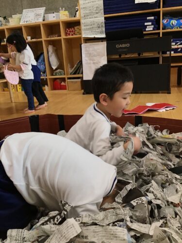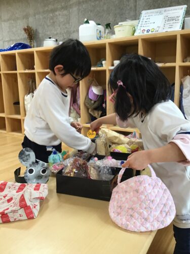 今日は、森の動物たちに なりきって、ごっこ遊び。 みんなで、ごちそうを 広げたり! お店屋さんに お買い物に行ったり。 ちゃーんとお金も 払いますよ! こちらは、お風呂。 みんなで入って 大盛り上がり!!