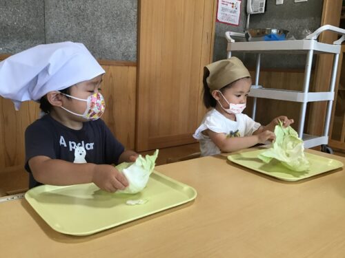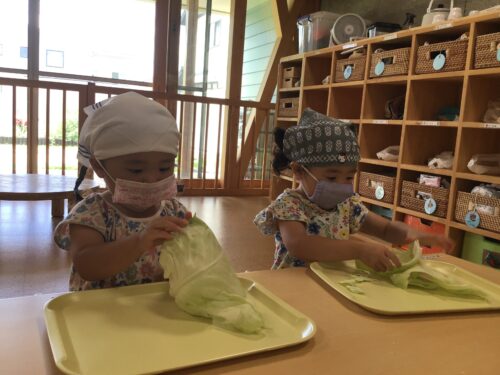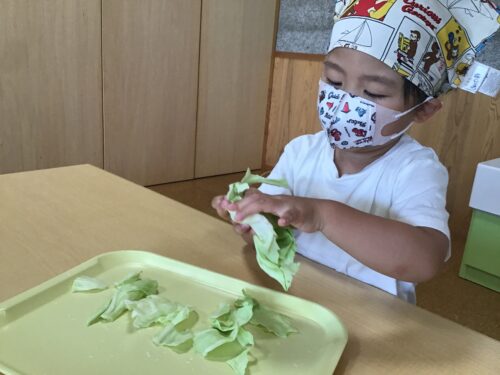 今日は、うさぎ組さん(2歳クラス) が、キャベツちぎりのクッキング! まずは、身支度を整えて 給食室の先生の所へ行きます。 『キャベツください!』 お部屋に戻って、みんなで ビリビリ・・・ちぎちぎ。 指先を使って真剣☆ 僕もやってみよう。 びりびり。キャベツ冷たくて 気持ちいいね! お友達と一緒にびりびり。 よく見て、手先を使って 真剣に、慎重に☆ ちぎったキャベツは 調理して、給食のおかずに出てきます。