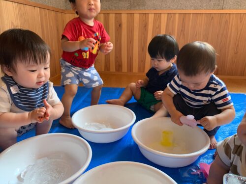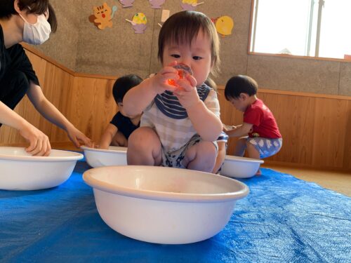 今日は、ひよこ組さん(0歳クラス)が 氷あそびをしています。 これは、なんだ? みんな興味津々です。 冷たい感触に始めは少し ビックリしていたけど、 だんだんと慣れてきました。 見て、触って、確かめて。 子ども達の探求心は尽きません☆