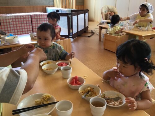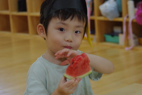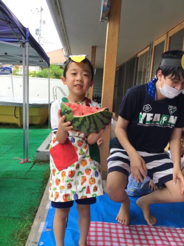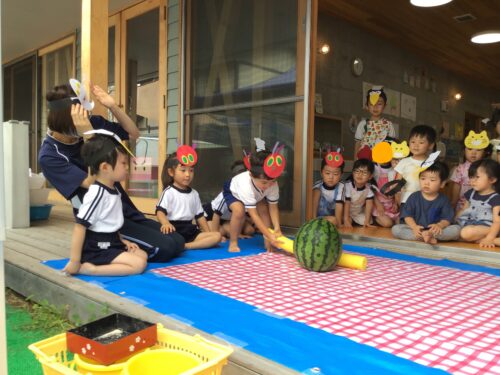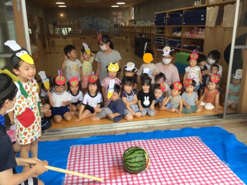 最後は、本のほいくえんの 夏まつりのメインイベント すいか割り!!! 小さなお友達も大歓声で 応援します。 ぱんだ組さん(3歳クラス)も 挑戦してみます。 がんばれー!! なかなか割れません・・・ 最後は年長さんの登場!! さすがは最高学年です。 みんなの期待を背負って 最後に割ってくれました。 僕が割ったよー!! 達成感でとても 満足そうです☆ 割ったスイカは、みんなで 給食の時間に食べました。 今年も盛りだくさんだった 本のほいくえんの夏まつり。 みんなが元気に楽しく 盛りあがってくれて、 先生達も達成感でいっぱいです☆