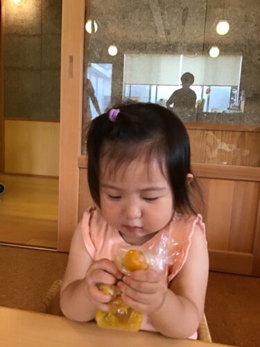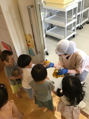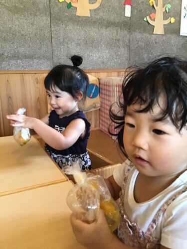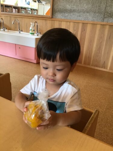 今日は、りす組さん(1歳クラス) がクッキング☆ 袋に入ったかぼちゃを モミモミ・・・。 あら、とっても真剣☆ 柔らかく茹でてもらった かぼちゃの感触に みんな楽しそう☆ 『給食の先生できたよー!』 つぶしたかぼちゃは、 今日のおやつに出てきます☆
