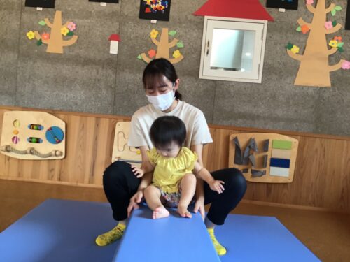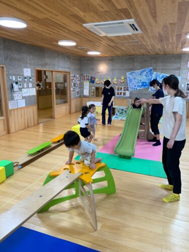 今日は、お部屋で大型スポンジマット を出して遊びます。 よじ登ったり、ジャンプして みたり。 先生と一緒にマットを ゆらゆらしてみたり。 おや? 大きいお兄さんお姉さんも お部屋で運動あそびを していました! いーれーてー!! いーいーよー!! 一緒にすべり台や 平均台にも挑戦してみました☆
