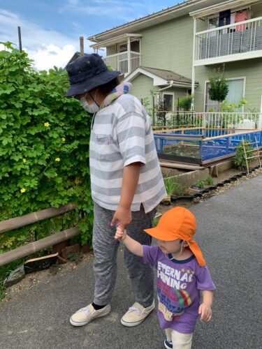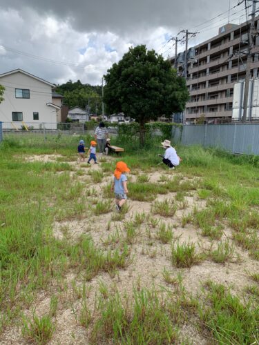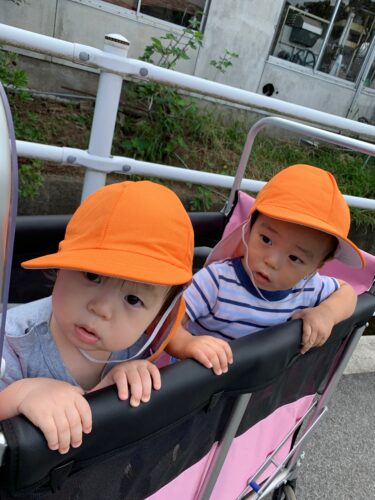 今日は涼しくなったので、 ひよこ組さん(0歳クラス) と、りす組さん(1歳クラス) は、近くの広場まで お散歩です。 先生と手をつないで 歩いてみます。 いっちに!いっちに! 楽しいね☆ こちらは、カートに 乗ってゴロゴロ☆ カートからは、どんな 景色が見えますかー? 広場に到着! みんな思い思いに 歩いたり、葉っぱを 手にしたり。 そろそろ秋の虫さんも いるかな?