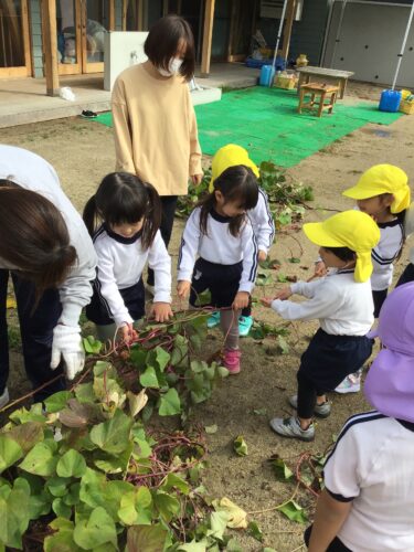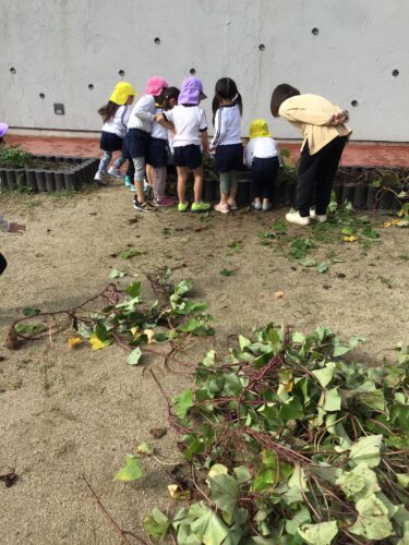 今日は、ぱんだ組(3歳クラス) と、ぞう組(4,5歳クラス)が サツマイモのつるとり! ながーいつるも、 みんなで引っ張って!! 畑の中には いろいろな虫が いて・・・ 時々手を休めて みんなで観察☆ わああ! たくさんのつる! このつるを使って 園庭で遊びました。 今週末は、みんなで 芋掘りです。