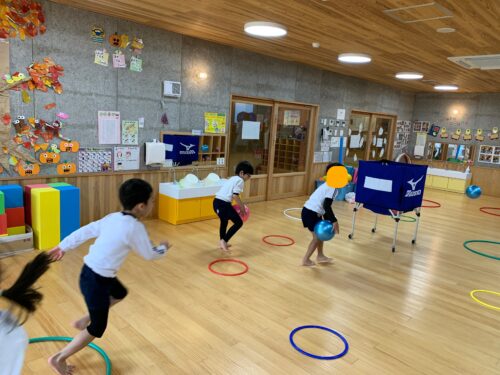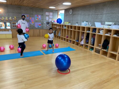 今日は、月に1回のバルシューレの日。 ぞう組さん(4,5歳クラス)が参加します。 講師の先生とも、とても仲良しで みんな楽しく身体を動かします! ボールだけでなく、様々な用具を 組み合わせ、いろいろなプログラムの 中から内容を決めて活動しています。