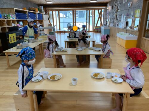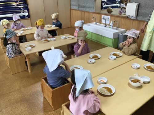 給食の時間には、カレーの上に
