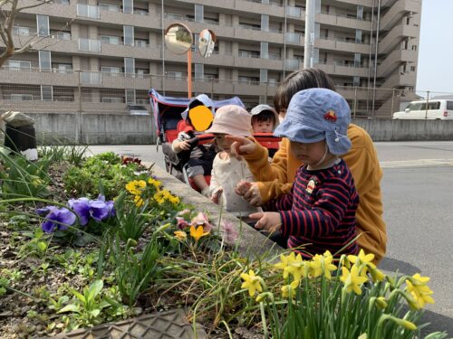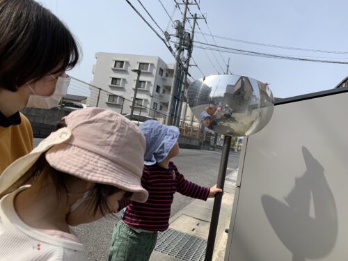 今日は、ひよこ組さん(0歳児クラス)が散歩へ出かけました。 近所の川には・・・なにが見えるのかな? 指さししながらのおしゃべりが弾みます! 道路の角にあるミラーに興味深々です。 不思議だね~みんな映っているね! きれいなお花をみつけたよ! 身近な景色の中でも新しい発見がたくさんのひよこ組さんでした。