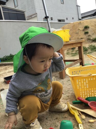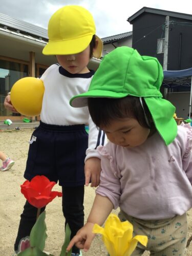 今日のりす組さん(1歳児クラス)は園庭で遊びました。 室内ではまだ不安で泣いていた子どもたちも、外に出ると気分も変わりとても楽しそう! チューリップが咲いてるね! 園庭では、お兄さんお姉さんたちと一緒に遊びます。 少しづつですが、確実に保育園の生活に慣れてきているりす組さんたちです。