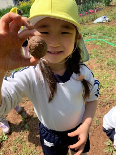 今日のぞう組さん(4,5歳児クラス)は、今年度から新しくお借りした農園に遊びに行ってきました! 広い畑だね!!何をそだてようか?そんな相談をしながら歩きます。 今日は畑のスペースで泥だんごを作って遊びました! 最初は、手が汚れることを気にしていた子どもたちも、だんだんと慣れてきて・・・ こんな上手にできたよ!丸いでしょ? 暖かい日差しのもと、土に触れる体験ができたぞう組さんでした。