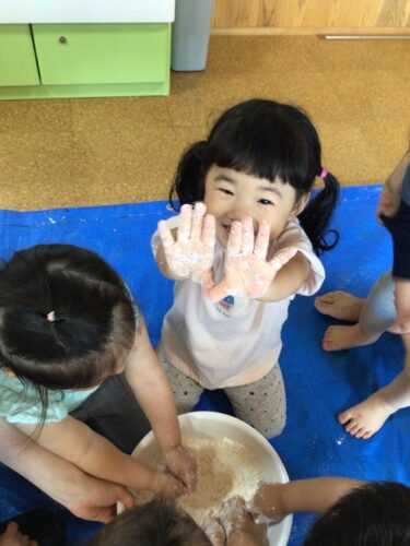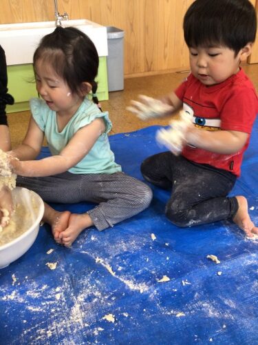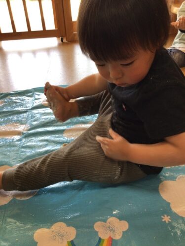 今日のうさぎ組さん(1,2歳児クラス)では、小麦粉粘土を作って遊びました。 粉の状態から、少しずつ水を足していきます。 「みて~こんなになった」少し感触が変わってきたね~ 終盤になってくると粘土状になって、こねて伸ばしてをいろいろな形にしてみます! だんだんと楽しくなってきたね! 小麦粉粘土の感触を楽しんだうさぎ組さんでしたが・・・ 最後は足の裏についた粘土が気になるようでした。