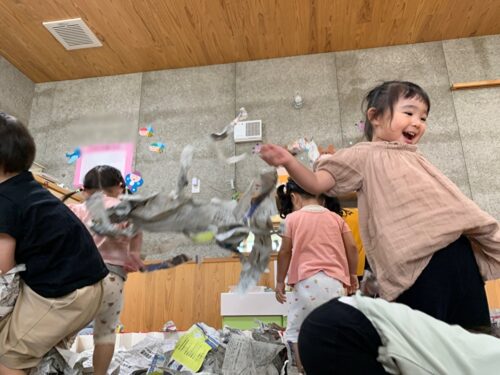 「ワー」っと上に投げてたり、新聞紙のプールに潜ってみたり、みんなで思い思いの新聞紙あそびを楽しみます!