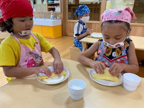 今日のぞう組さん(4,5歳児クラス)とぱんだ組さん(3歳児クラス)は 午後おやつの時間にクレープを作って食べました! クレープ生地を広げ、クリームをたっぷりつけて、果物をのせていきます。 自分たちで作ったクレープは美味しくて、 あっという間に食べてしましました。 いろいろなことをやってみたい子どもたち、 クッキングにも意欲的にチャレンジできました!