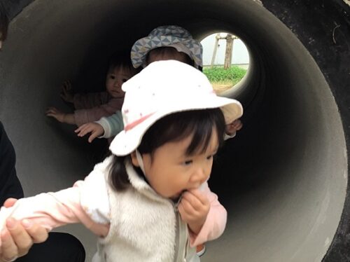 今日のひよこ組さん(0歳児クラス)は園庭で遊びました。 ぞう組さん(4,5歳児クラス)のお姉さんもひよこ組さんのお友達が気になるようで、 一緒になって遊びましたよ。 あちらでは「向こうへ行こうよ!」と合図するお友達が。どこへ行きたいのかな? 築山のトンネルに行きたかったようです! お友達をさそってトンネルへ。 園庭で活発に動き回ったひよこ組のみんなでした。