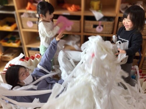 ペーパーを頭からかぶってみたり、身体に巻き付けてみたり、先生も楽しそうです。