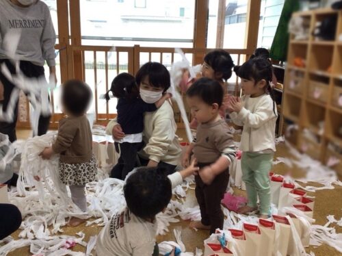 今日のうさぎ組さん(1,2歳児クラス)はトイレットペーペーやお花紙を使ってパルプ粘土を作って遊びました。
