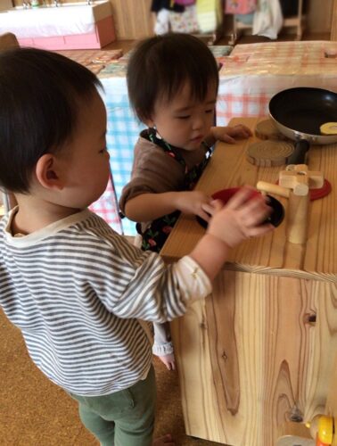 今日のひよこ組さん(0歳児クラス)は、キッチン台を持ってきておままごと遊びをしました。