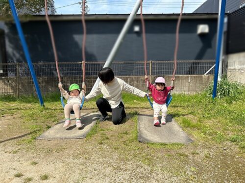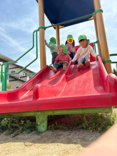 今日のうさぎ組さん(1,2歳児クラス)は、公園へ行って遊びました。 お散歩ロープを上手に持って歩いて向かいます。 公園では、滑り台やブランコなどで遊びます。 いろんな遊具があって楽しいね! ブランコ上手にのれるかな? あたたかくなった春の日差しのもと、 公園で遊具遊びを楽しんだうさぎ組のみんなでした。