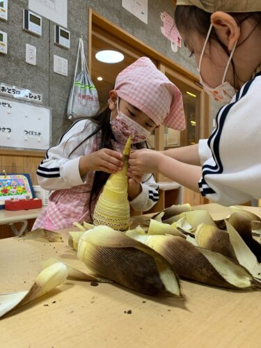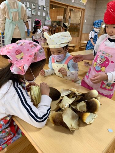 今日のぞう組さん(4,5歳児クラス)はクッキングでタケノコの皮むきをしました。 泥のついたタケノコは・・・手が泥だらけに。 これ、なんだろうね? 皮がむけることがわかると、楽しくなってどんどんむいていきます。 こんなにキレイになったよ! キレイにした後は、タケノコご飯にしてもらい美味しくいただきました。 むいた皮が面白い形をしているので、みんなは遊びに使いたい様子。 皮は外できれいに洗って、ままごと遊びに使いました。 旬の食材でクッキングを楽しんだぞう組さんでした。