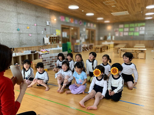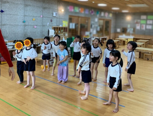 今日は新年度初めての英語あそびの日。 ぞう組さん(4,5歳児クラス)が参加しました。 みんな元気よく歌とダンスを楽しみます。 先生の動きに合わせて動いたり、虫の動きをみんなで考えて動いてみたりしました。 虫の動き方ってどんなかな? みんな面白い動きが出来てたよ(笑)。 最後はアルファベットを書くことにも挑戦。 今日も英語の世界を楽しんだぞう組のみんなでした。