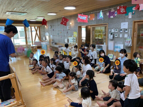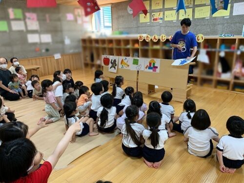 今日は、5月生まれのお友だちの誕生会でした。 誕生日を迎えた子どもたちは前に出てみんなにお祝いしてもらいます。 前にでると恥ずかしくなった子もいましたが、 お祝いのメッセージを読んでもらうとみんな嬉しそう。 先生からは、しりとり遊びのクイズです。 「リンゴ」、「ラッパ」の間に入るものは何かな? 「ゴリラ!」おおきな声で答えてくれました。 「ラッパ」と「積み木」の間に入るのはなにかな・・・? しりとり遊びにみんな大喜び。 にぎやかな誕生会となりました。
