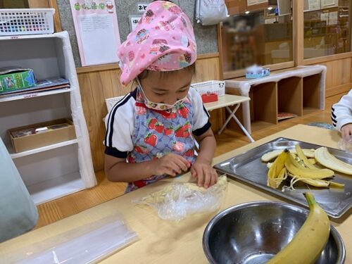 今日のぞう組さん(4,5歳児クラス)はクッキングをしました。