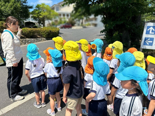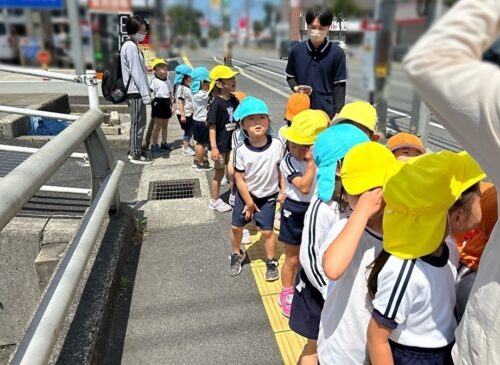 道路を渡るときは、「右をみて、左をみて~渡れると思ったら、手をあげて渡りましょう。」