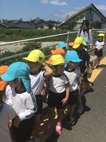 ぞう組さんのお兄さん、お姉さんが手を引いて避難所まで歩きます。
