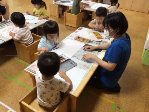 今日のうさぎ組さん(1,2歳児クラス)は、クレヨンや色鉛筆を使ってお絵描きをしました。 それぞれがいろいろな色を使って、絵を描いていきます。 どんな絵が描けるかな? 「〇〇みたい~」 いろいろな形を描きながら、イメージをふくらませているようです。 白い紙がなくなってもまだ描き足りない様子の子どもたち。 時間いっぱいお絵描きを楽しんだうさぎ組のみんなでした。