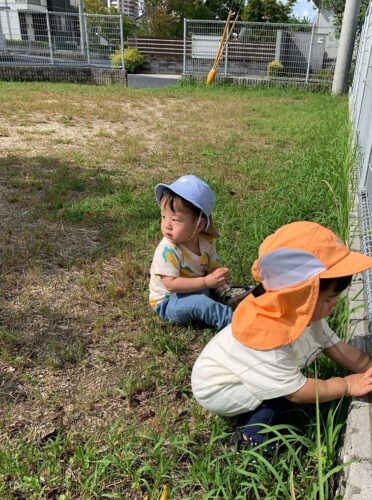 今日のひよこ組さん(0歳児クラス)はお散歩へ出かけました。 さわやかな秋晴れのもと、道行く景色を楽しみます。 近くの公園では、ベビーカーから降りると、 さっそく気になるものが沢山あり、思い思いに探索しました。 「よいしょ」2人とも息がピッタリ。 敷物の上から気になるものを見つけては触って確認です。 今日もお外で自然に親しんだひよこ組のみんなでした。
