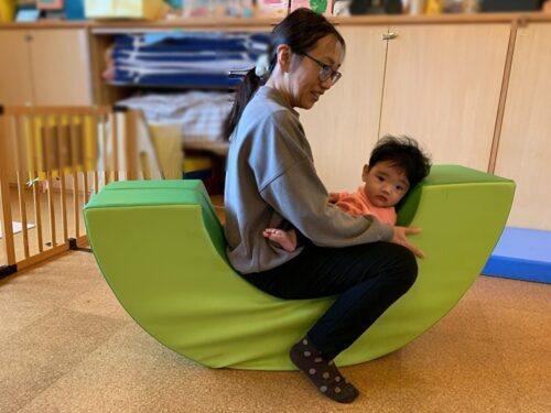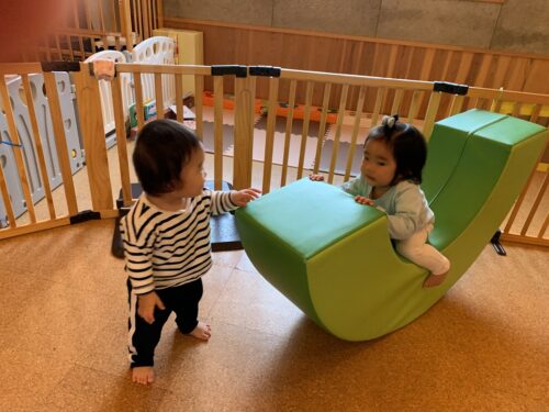 今日のひよこ組さん(0歳児クラス)は室内で運動遊具を出して遊びました。 坂になった平均台も普通に登れるよ! 「僕がゆらゆらしてあげる~」 ソフトブロックに乗ってゆらゆらするのが楽しい様子。 大好きな先生と一緒に乗ってゆらゆらしてもらいます。 他にもマットをよじ登ったり、たくさん体を動かしてあそんだひよこ組さんでした。