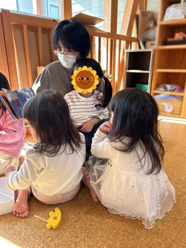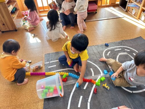 今日のうさぎ組さん(1,2歳児クラス)はお部屋で遊びました。 はじめは、音楽に合わせて踊ったり、ジャンプして遊んだりしました。 あとから、りす組さん(1歳児クラス)が遊びに来てくれて、みんな一緒に遊びました。 小さい子たちとおもちゃを分け合いながら仲良く遊びます。 男の子たちはミニカーで遊んだり、女の子たちは先生に絵本を読んでもらったり、 それぞれにゆったりとした時間を過ごしました。