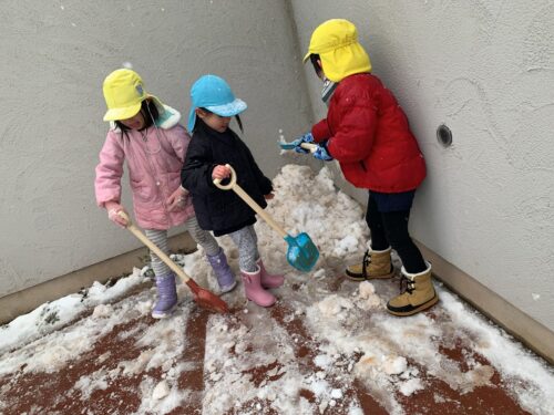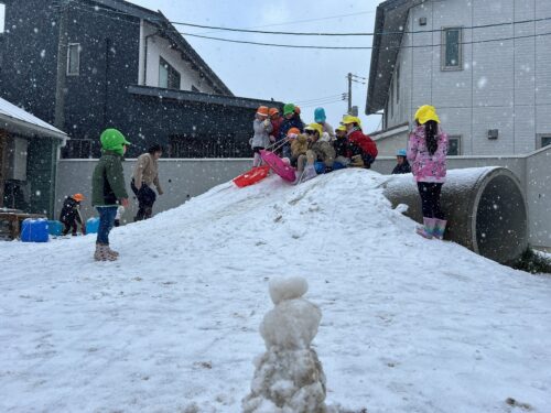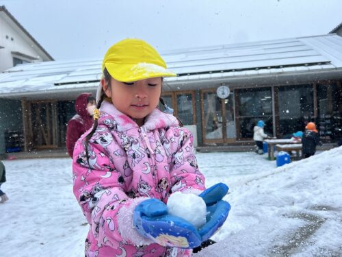 昨日からの雪模様で、園庭にもうっすら雪が積もっていました。 ぞう組さん(4,5歳児クラス)、ぱんだ組さん(3歳児クラス)、うさぎ組さん(1,2歳児クラス)は 早速、外に出て雪遊びをしました。 築山の上からのソリ遊びが始まりました。 下まで上手に滑ることができます。 「見て~雪だま作ったよ~」 丸い雪だまを作って見せてくれました。 ここに雪を集めて、かまくら出来るかな? ちょっとたりないな~ もう少し雪がふればいいのにね。 少しの間でしたが、雪遊びを楽しんだ子ども達でした。