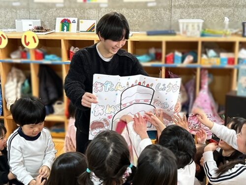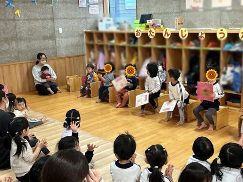 今日は、2月生まれのお友だちの誕生会でした。 誕生日を迎えるお友だちが今日は大勢でした。 みんなで歌を歌ってお祝いします。 担任の先生からは、誕生カードを渡してもらい、みんなご機嫌です。 年長さんの誕生カードの手形を見せてもらうと、大きくてみんなから歓声が上がりました。 先生からのプレゼントは「ケーキ作り」のパネルシアターです。 子どもたちは、ケーキができるまでを興味深々で眺めていました。 ケーキが出来上がるとみんなでたべちゃいました。(笑) 今月もにぎやかな誕生会となりました。